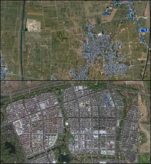 拼版照片:2021年8月,航拍镜头下的河北省容城县小里镇胜利庄村(上图);2024年6月,航拍镜头下的雄安新区容东片区街道(下图)。