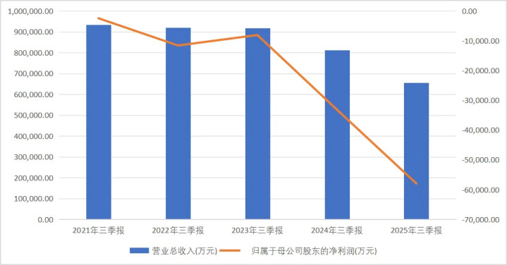 三季报显示,公司2025年前三季度收入与利润同比降幅均超70%,远高于行业平均水平。营业收入65.52亿元同比下降19.41%,归母净利润-5.8亿元同比暴跌74.83%,亏损幅度持续扩大。