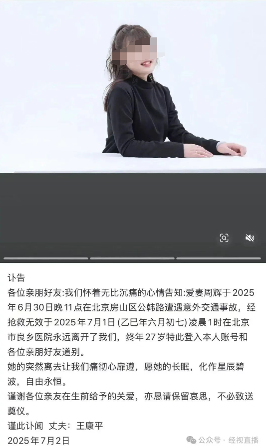 “各位亲朋好友,我们怀着无比沉痛的心情告知,爱妻于2025年6月30日晚11时在北京房山区公韩路遭遇意外交通事故,经抢救无效于2025年7月1日(乙巳年六月初七)凌晨1时在北京市良乡医院永远离开了我们,终年27岁,特此登入本人账号和各位亲朋好友道别。”