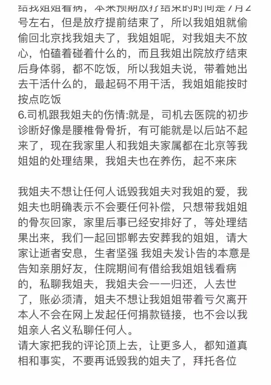 “现在我家里人和我姐夫家属都在北京等我姐姐的处理结果,我姐夫也在养伤,起不来床,我姐夫不想让任何人诋毁他对我姐的爱。”周辉的妹妹说,姐夫明确表示不会要任何补偿,但车祸事故赔偿她们家会给姐夫一部分,姐夫只想带姐姐的骨灰回河北邯郸老家,家里后事已经安排好了,等事故处理结果出来,会一起回邯郸去安葬姐姐,请网友们让逝者安息,再不要乱猜疑。”