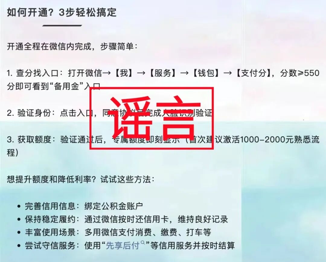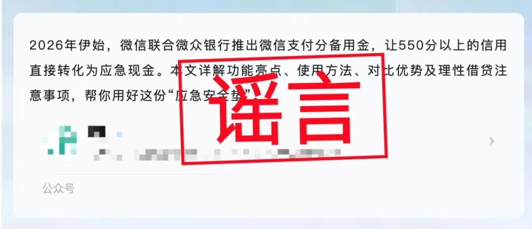 1月21日,21财经《辟谣财知道》注意到,最近,网络上出现部分文章称,“2026年1月,微众银行联合微信推出的‘微信支付分备用额度’正式上线”。经核实,上述信息不属实。这类文章冒用微信支付分和微众银行的名义,声称“微信支付分能领备用金”、或“支付分达标即可提现”。这些均为虚假不实信息!