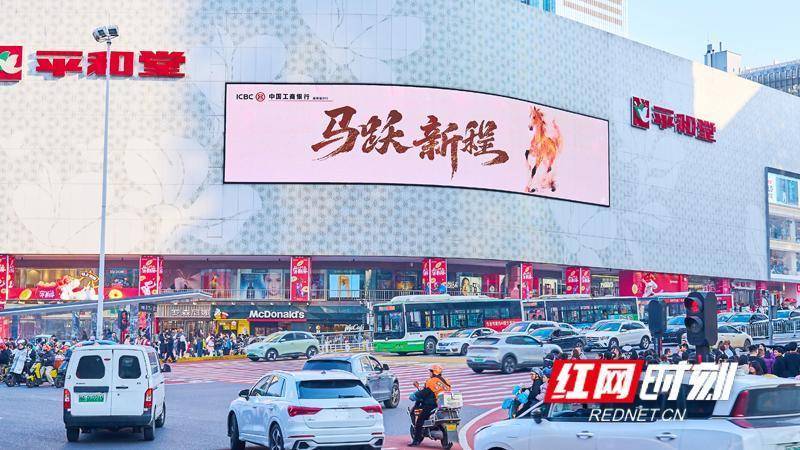 工商银行湖南省分行新春祝福主题海报亮相长沙五一大道袁家岭LED屏。红网时刻新闻2月15日讯(记者 吴芳)“马跃新程,丹华呈祥”!新春佳节来临之际,工商银行湖南省分行携手红网开启千屏联播,点亮长沙五一广场、芙蓉广场等核心商圈户外LED大屏,将国有大行的温情与担当融入浓浓的节日氛围,向三湘父老乡亲传递新春祝福。